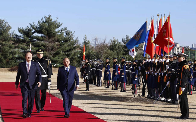 Chiều 5/12, theo giờ địa phương, Lễ đón chính thức Chủ tịch nước Nguyễn Xuân Phúc đã diễn ra trang trọng tại Văn phòng Tổng thống Hàn Quốc, thủ đô Seoul, theo nghi thức cao nhất của Hàn Quốc dưới sự chủ trì của Tổng thống Đại Hàn Dân Quốc Yoon Suk Yeol.
