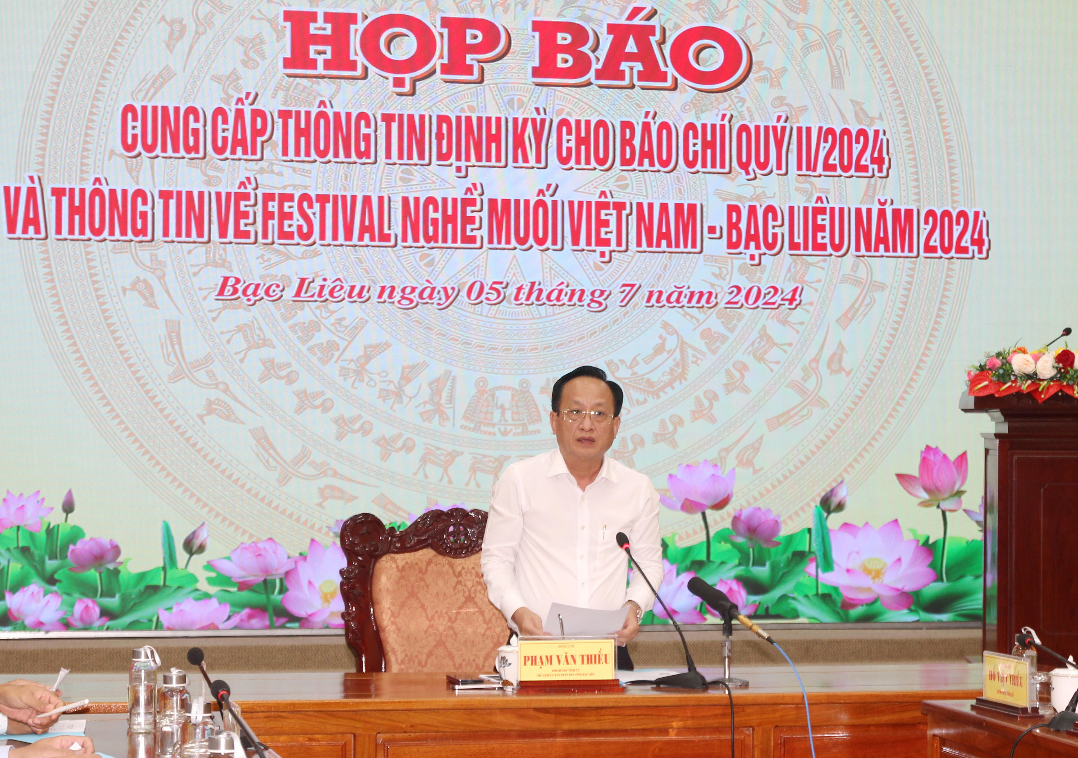(PLVN) - Chiều 5/7, ông Phạm Văn Thiều - Phó Bí thư Tỉnh ủy, Chủ tịch UBND tỉnh Bạc Liêu chủ trì buổi họp cung cấp thông tin định liên quan công tác chuẩn bị Festival nghề muối Việt Nam - Bạc Liêu năm 2024.