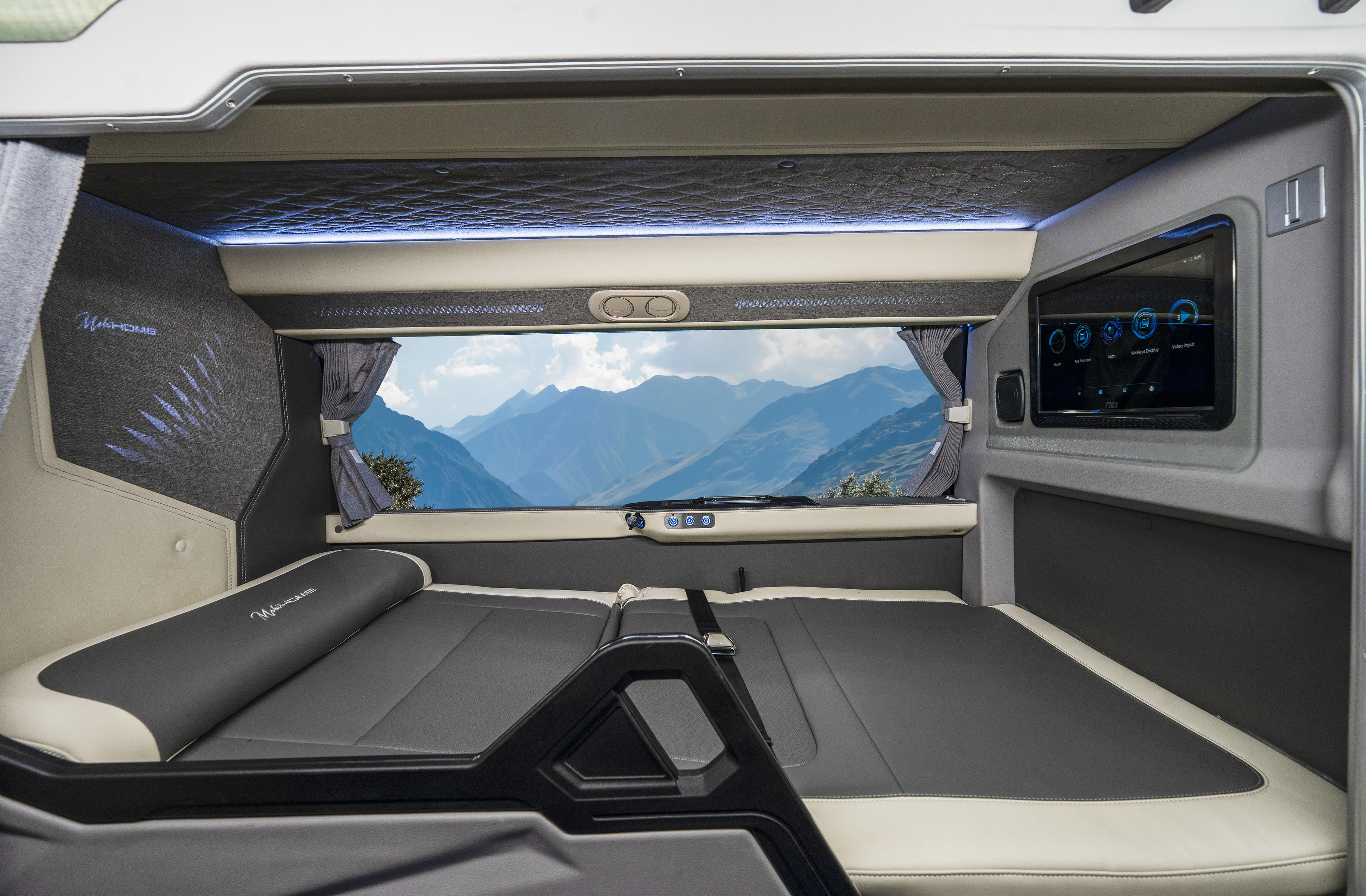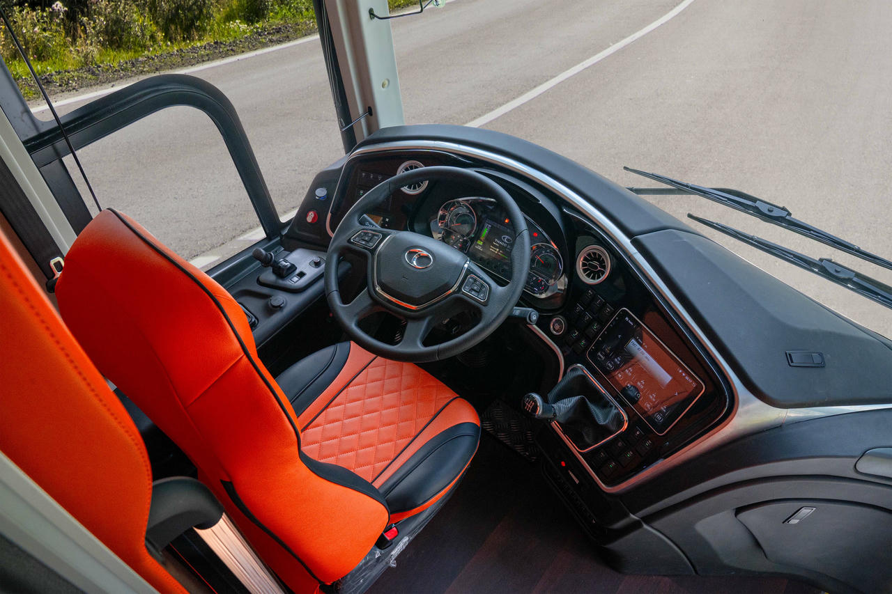 Khoang lái được thiết kế rộng rãi, hỗ trợ tối đa cho tài xế: vô lăng đa chức năng hỗ trợ thao tác linh hoạt; màn hình cảm ứng 10.1 inch hiển thị đa thông tin và kết nối điện thoại thông minh. Ghế tài xế cân bằng hơi, thiết kế công thái học, có khả năng điều chỉnh linh hoạt, nhằm giảm mỏi khi di chuyển đường dài.