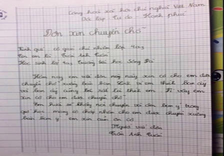 (PLO) - Một học sinh lớp 4 viết đơn xin chuyển chỗ ngồi vì thích một bạn trong lớp. Lá đơn khiến người lớn bật cười nhưng cũng gây ra không ít nỗi lo cho các bậc phụ huynh.