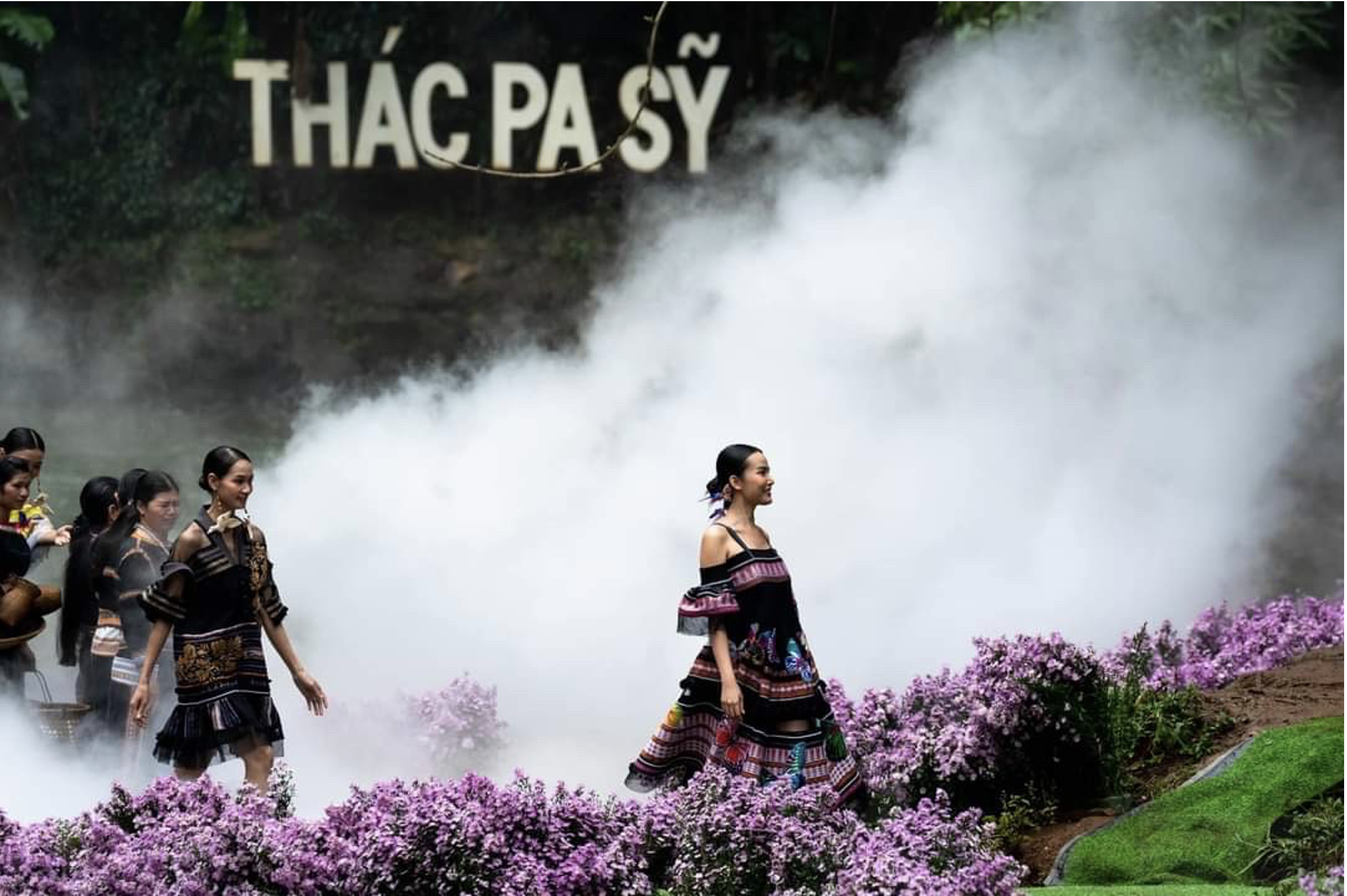 | Các màn trình diễn áo dài trên nền vải thổ cẩm được diễn ra trong khung cảnh đẹp huyền bí thơ mộng như tiên cảnh tại thác Pa Sỹ. |