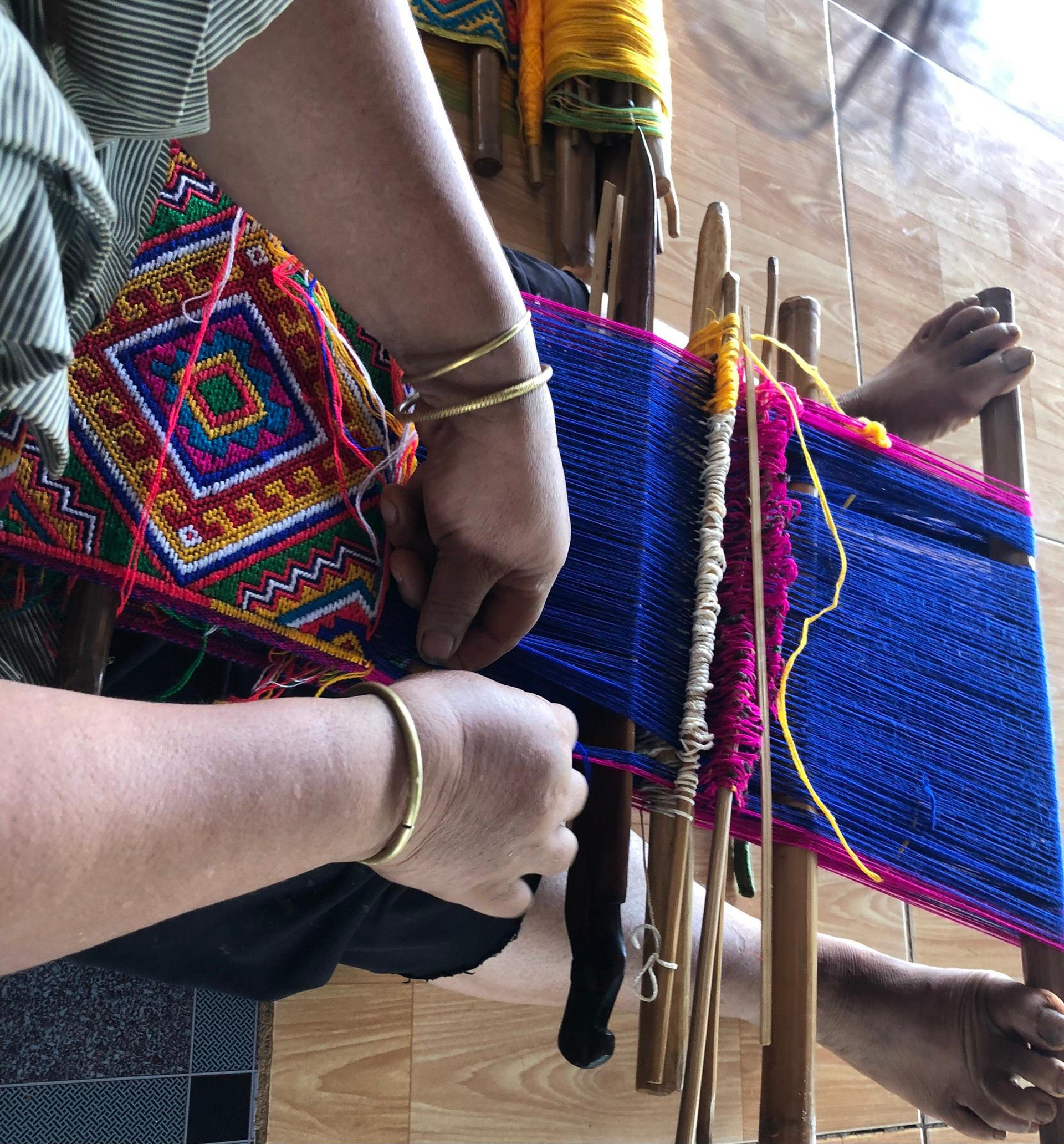 Đó là sự kết hợp linh hoạt giữa chân, lưng và tay của người phụ nữ, nếu không có sự phối hợp đó thì khó mà lên khung được. Để có một tấm vải chỉnh chu phải tổ chức dệt 3 tấm riêng, gồm một tấm mẹ với hai tấm con, sau đó sẽ ghép lại thành một tấm lớn, và tên của tấm thổ cẩm được đặt theo tên tấm mẹ.