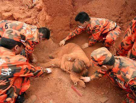 Cả đội đã cùng nhau làm việc; họ cẩn thận dỡ bỏ những cái cọc trong đống đổ nát xung quanh người phụ nữ. Có một cậu bé 3 tháng tuổi được bọc trong một chiếc chăn hoa bên dưới thi thể của người mẹ. Rõ ràng, người phụ nữ đã hy sinh để cứu con mình. Khi ngôi nhà sập, cô đã lấy thân mình làm tấm chắn bảo vệ Con trai. Cậu bé vẫn đang ngủ một cách yên bình khi đội cứu hộ nhấc em lên.