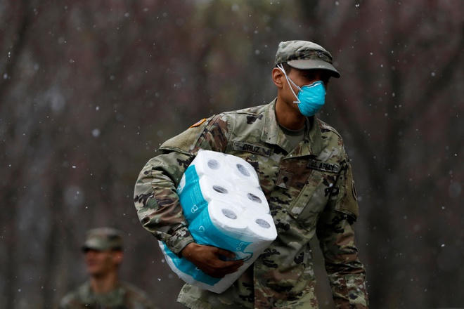 Một quân nhân thuộc Vệ binh Quốc gia Mỹ mang giấy vệ sinh đến khu vực được cách ly ở New York. Ảnh:Reuters. |