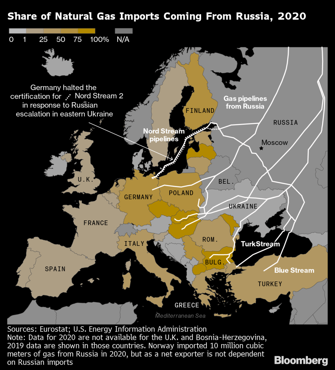 Bản đồ khí đốt Nga toả khắp châu Âu, với mức nhập khẩu khí đốt từ Nga giảm dần theo sắc độ màu vàng. Nguồn: Bloomberg