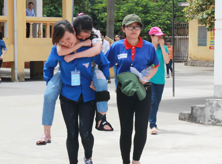 Hai hôm nay, hai mẹ con không dám đi thi bằng xe máy mà thuê phòng trọ gần điểm thi. Huyền được các sinh viên tình nguyện đến chở đi bằng xe máy và cõng vào phòng thi rồi cõng ra đưa về phòng trọ.