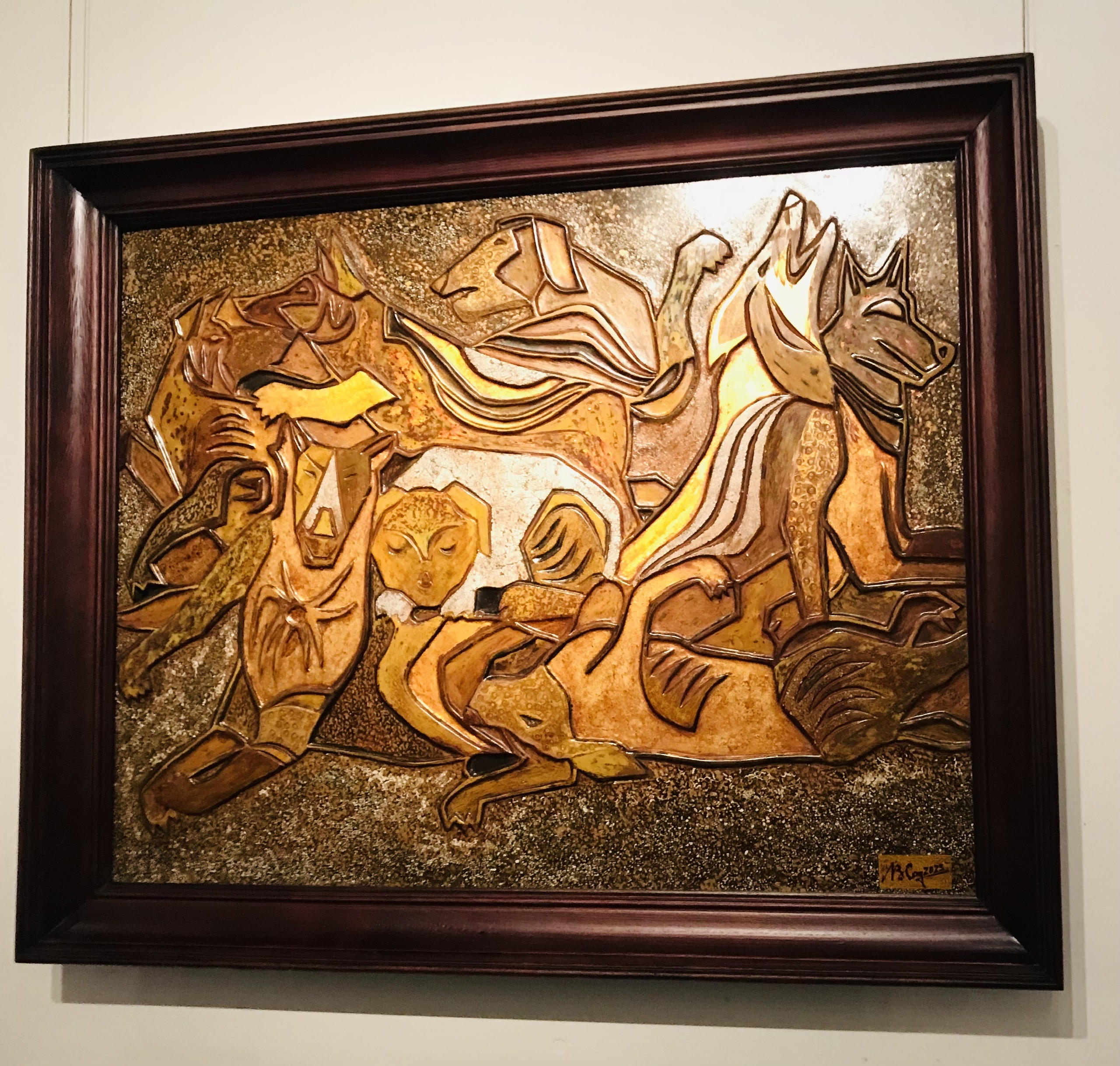 Một tác phẩm sơn mài đắp nổi của họa sĩ Ngô Bá Công trưng bày tại triển lãm (ảnh Thùy Dương). |