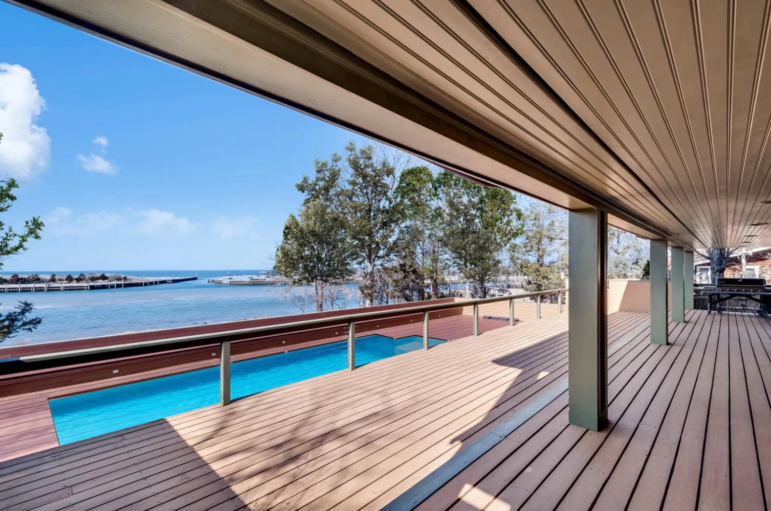 Căn biệt thự có một bể bơi ngoài trời riêng biệt, nhìn ra bờ biển Long Island.