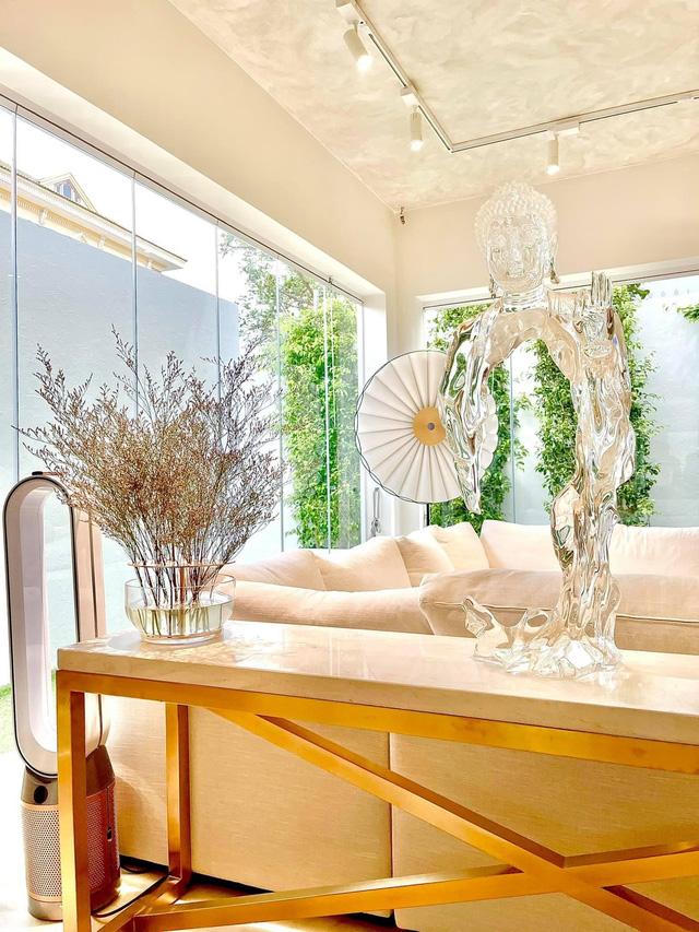 Điểm nhấn trong phòng khách có thể kể đến bức tượng Phật bằng chất liệu trong suốt. Được biết, đây là một món quà từ người bạn thân nên nữ ca sĩ rất trân quý. Xung quanh phòng khách đều được lắp kính để tận dụng đón ánh sáng tự nhiên vào căn phòng.