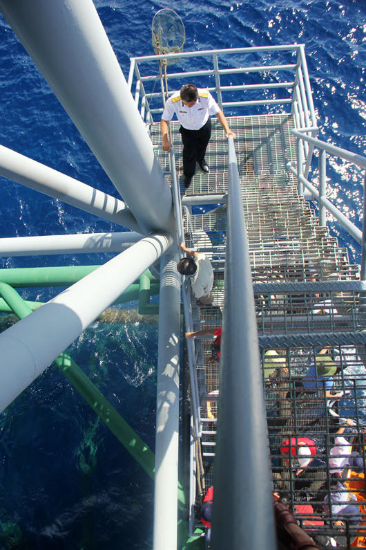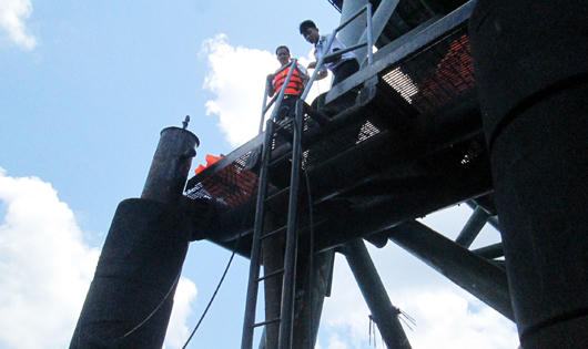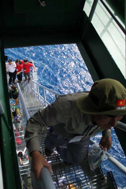 Những bậc cầu thang dựng ngược, nằm trên mực nước biển chừng 5 - 10m. Khi sóng dềnh lên là tay phải bắt chặt vào bậc cầu thang sắt, chân trèo lên vội. Nếu chỉ cần một giây ngần ngại thì sóng biển sẽ ném người xuống biển, nếu chân không kịp rời thuyền chuyển tải.