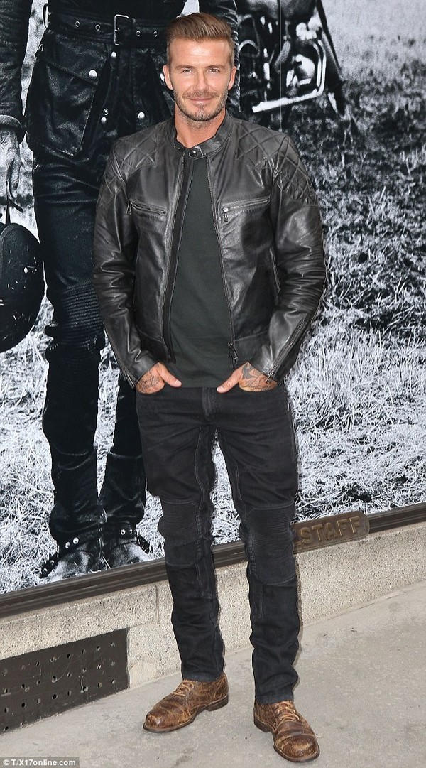 Trong một vài sự kiện, David Beckham cũng lựa chọn phong cách bụi bặm với áo khoác da và quần jeans.
