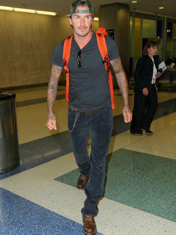 Thời trang sân bay của cựu danh thủ cũng khiến nhiều tín đồ "mê mẩn", Beckham thường lựa chọn cho mình những set đồ bụi bặm cực chất, mỗi lần xuất hiện tại sân bay, trông anh không khác gì một fashionista thực thụ, jeans rách, áo phông trơn, jacket bomber, những chiếc áo khoác thể thao cũng phụ kiện là chiếc dây xích ở một bên túi quần đã khiến cho Beckham luôn nổi bật với hình ảnh ông bố sành điệu.