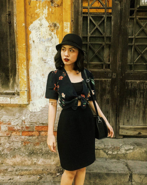 Cô nàng fashionista Hà Nội này sở hữu những outfit thời trang đường phố đơn giản mà nổi bần bật. Chiếc quần họa tiết thổ cẩm với ống loe rộng là điểm nhấn chính dù chỉ được phối cùng áo pull đen đơn giản. Sự rộng rãi và mềm mại của nó giúp “ăn gian” chiều cao cho Mai Hoàng.