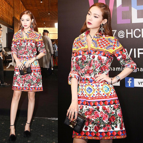Diện cả cây Dolce&Gabbana với họa tiết rực rỡ, siêu bắt mắt khi tham dự sự kiện, Minh Hằng thu hút mọi ống kính về phía mình trong outfit đỏ và hồng rực rỡ kết hợp lối trang điểm “tóc nâu môi trầm” quyến rũ.
