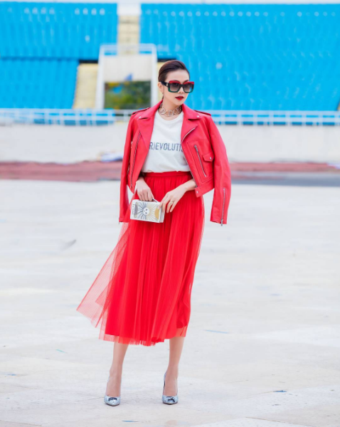 Xứng đáng với danh hiệu Nữ hoàng đồ hiệu Việt Nam, bất cứ món đồ nào được Thanh Hằng “dát” lên người cũng là món phụ kiện kiêu sa lộng lẫy. Váy tulle đỏ lạ mắt mix với áo khoác da biker ton-sur-ton là sự lựa chọn hoàn hảo cho thời trang street style ngày xuân-hè.