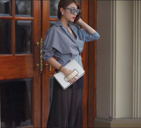 Túi xách J’ADIOR ngày càng được nhiều sao trong và ngoài nước diện để nhấn nhá thêm cho vẻ ngoài của riêng mình. Yumi Dương chọn cách phối chiếc túi cầm tay này với một chiếc áo thanh lịch và váy sheer xuyên thấu.