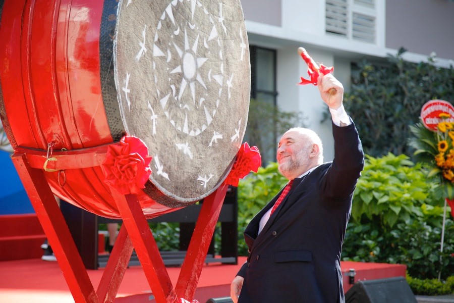Thầy Sean P. O’Maonaigh - Giám đốc Chương trình Cambridge đánh trống khai giảng, bắt đầu năm học mới.