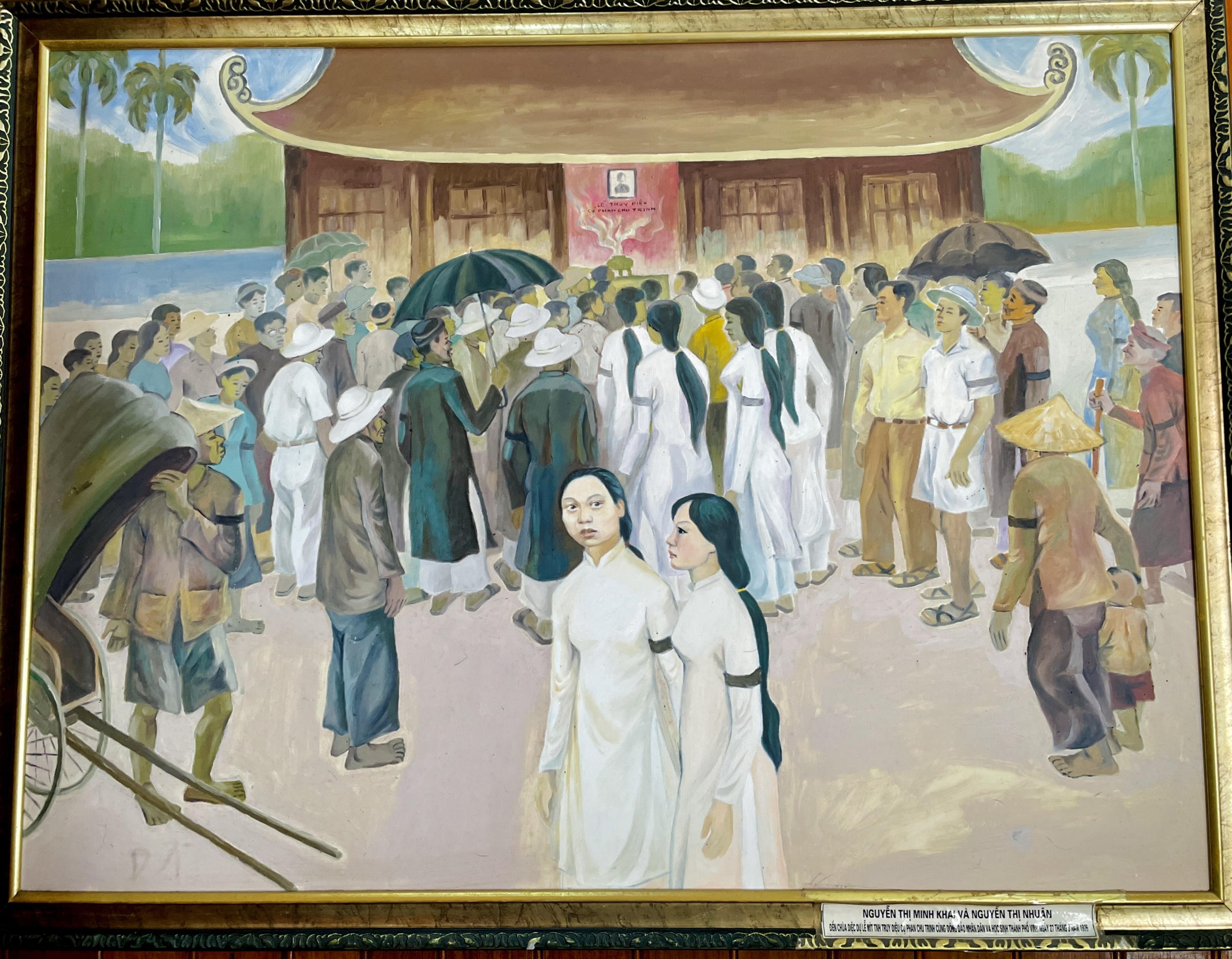 Phác họa bà Nguyễn Thị Minh Khai và Nguyễn Thị Nhuận đến chùa Diệc dự lễ truy điệu cụ Phan Chu Trinh cùng đông đảo nhân dân và học sinh thành phố Vinh ngày 27/3/1926. Ảnh: Thiên Ý