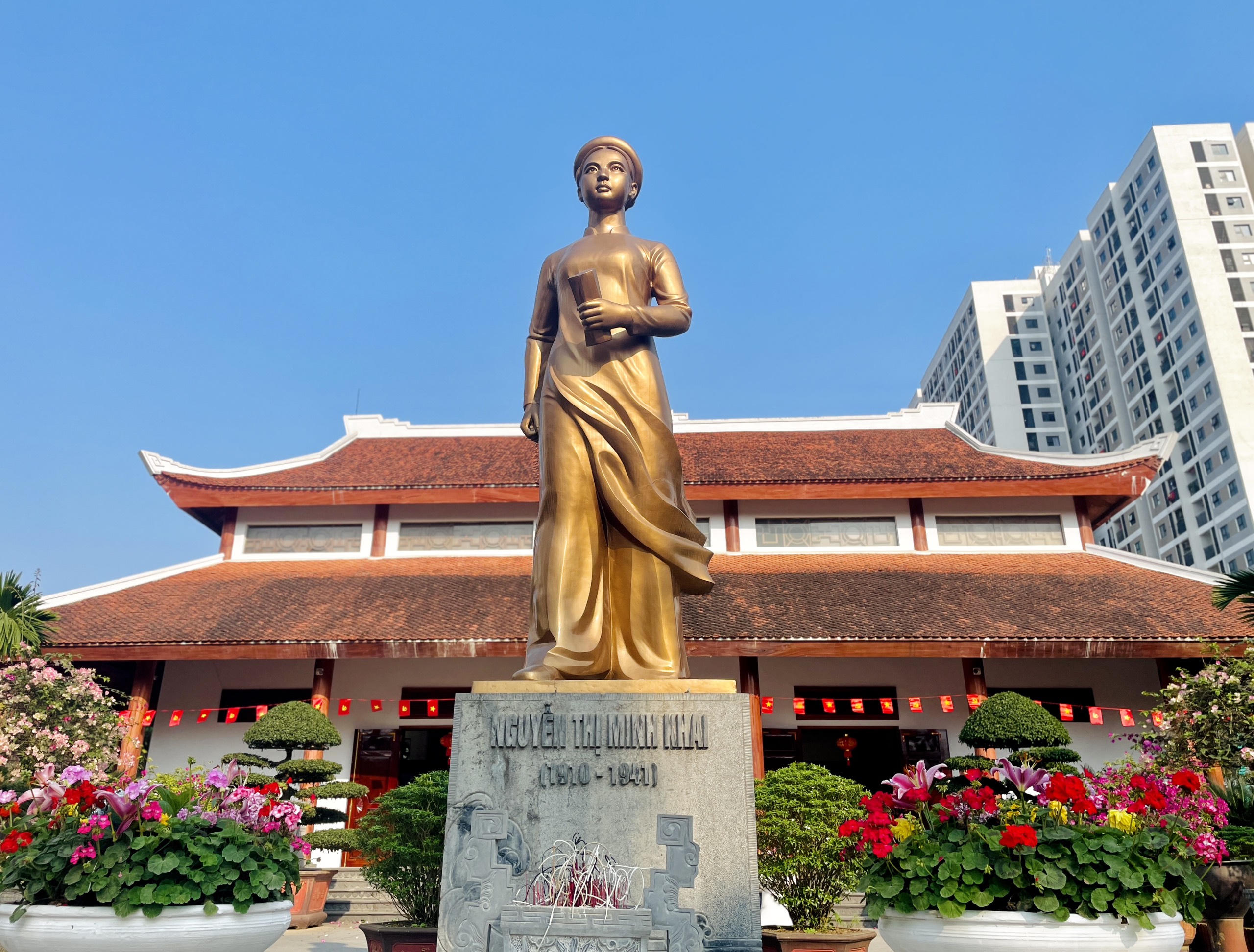 Bức tượng đài bà Nguyễn Thị Minh Khai được đúc bằng đồng theo thể loại tượng chân dung đặt trên bệ cao, khắc họa hình ảnh người thiếu nữ duyên dáng trong tà áo dài, chân bước đi đầy khí phách. Ảnh: Thiên Ý