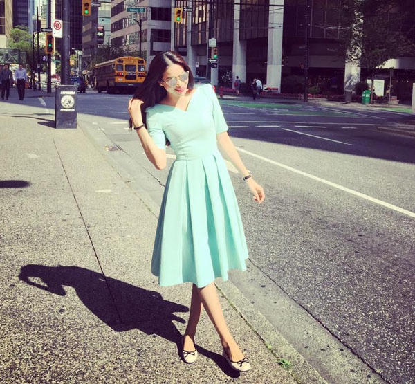 Váy xòe màu xanh bạc hà giúp cô nàng thỏa thích di chuyển khi dạo phố trong chiều nắng.