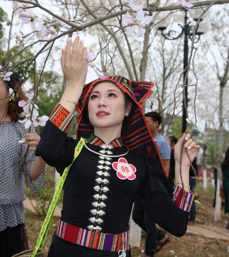 Thiếu nữ dân tộc Thái "xinh như mộng" tham gia trình diễn thực cảnh người đẹp hoa ban.