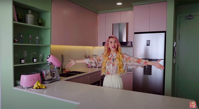 Căn bếp được Quỳnh Anh trang trí 3 tông màu chủ đạo là xanh, trắng và hồng, được thiết kế tinh tế và gọn gàng. |