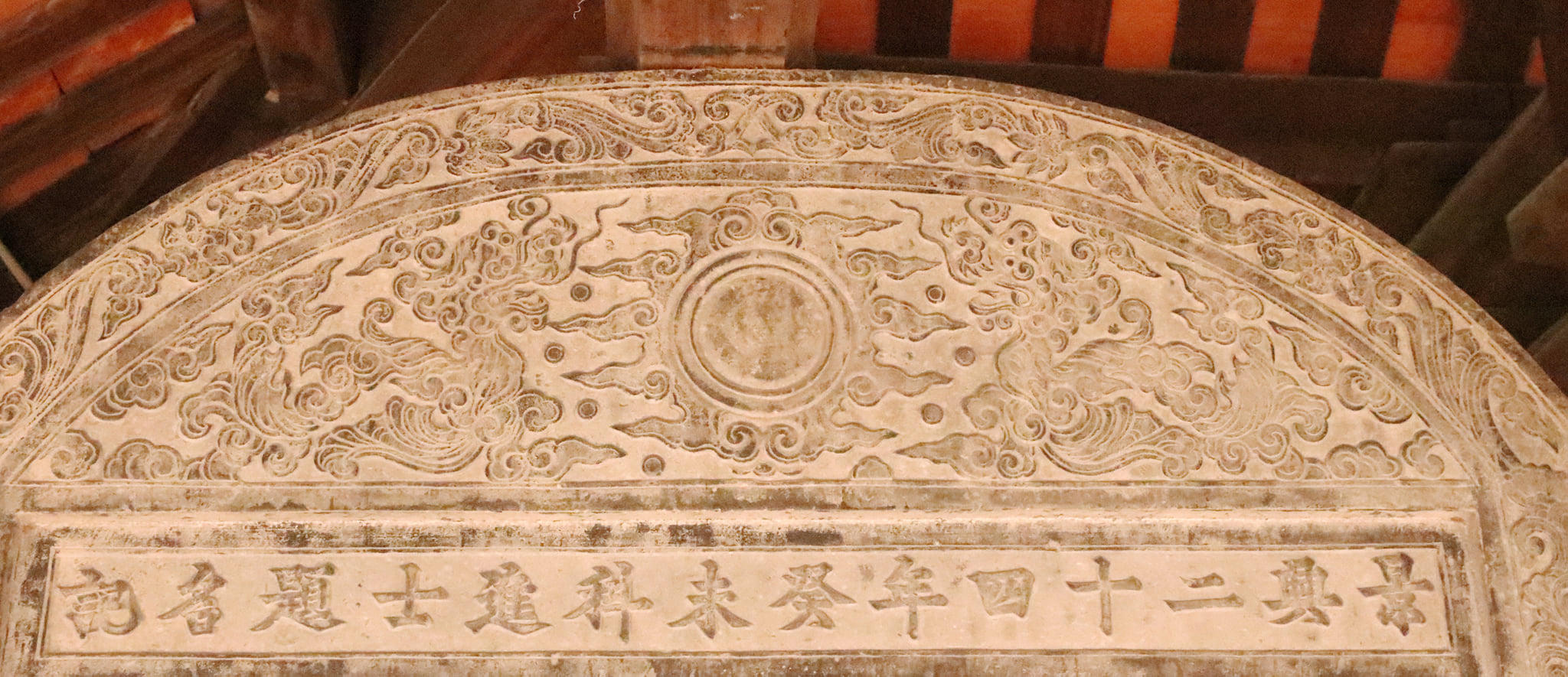 Trong 82 tấm bia Tiến sĩ tại Di tích có tới 46 tấm bia được trang trí hình rồng ở nhiều kiểu dáng, vô cùng sinh động. Hình tượng rồng luôn được dành một vị trí hết sức trang trọng. Rồng được thể hiện theo bố cục một đôi rồng chầu vào mặt trời có mây lửa bao quanh. Bản thân hình ảnh mặt trời mây lửa có lẽ cũng được coi như một hình tượng tiêu biểu của nguồn sáng tri thức bất tận và nhiệt huyết của mỗi nho sinh trên con đường phấn đấu thành tài.