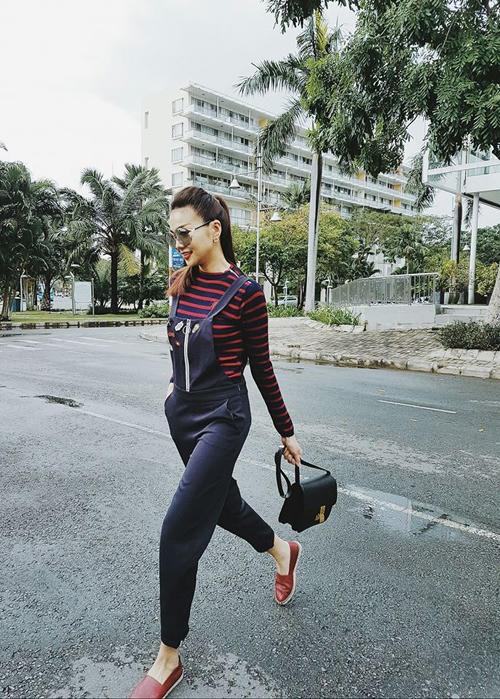 Cùng hưởng ứng trào lưu diện đồ tôn nét năng động, trẻ trung xuống phố, Thanh Hằng chọn cho mình mẫu quần yếm đáng yêu để phối cùng áo kẻ sọc và giày đế bệt