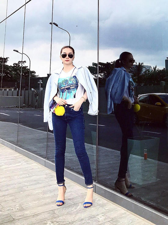 "Cô bé trà sữa" Kiều Trinh chọn áo phông, quần jeans năng động cho ngày dạo phố chớm hè.