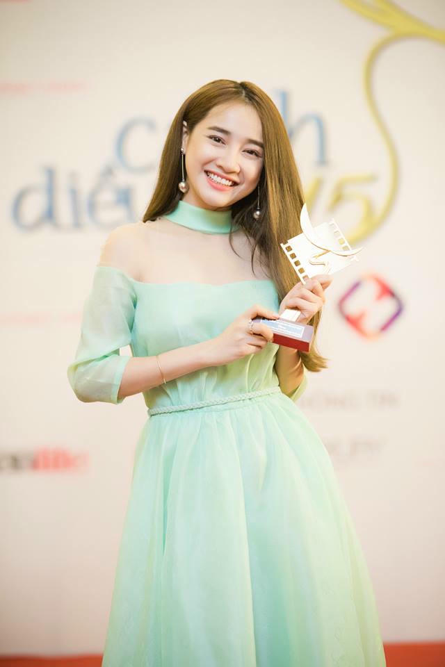 Nhã Phương - chủ nhân của giải Nữ diễn viên chính xuất sắc nhất hạng mục Phim truyền hình chọn chiếc váy xanh bạc hà bồng bềnh phù hợp độ tuổi. Tuy nhiên phần đuôi váy hơi dài và rườm rà khiến bạn diễn Quang Tuấn phải vất vả hỗ trợ cô khi cùng lên nhận giải.