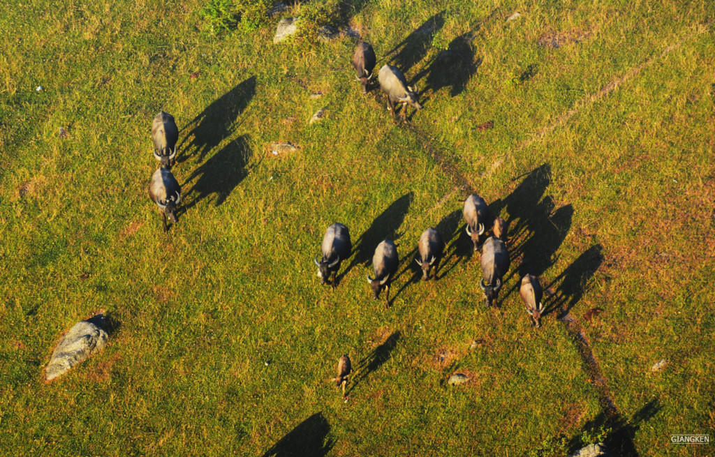 Những cậu bé mục đồng lùa trâu lên ăn cỏ. Bóng của chúng đổ dài trên thảo nguyên.