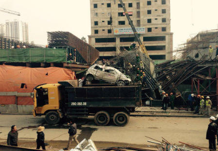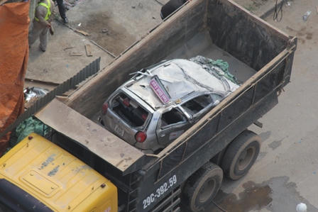 Sau hơn 10 tiếng đồng hồ xảy ra sự cố sập giàn giáo tại lý trình Km7+703,600 - Km7+798,400, vị trí ga bến xe Hà Đông, thuộc Dự án tuyến đường sắt trên cao Cát Linh - Hà Đông, cuối cùng chiếc taxi mới được đưa ra khỏi hiện trường đống đổ nát.