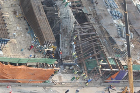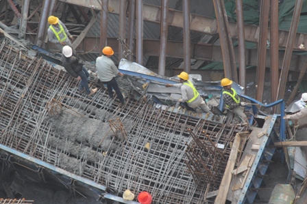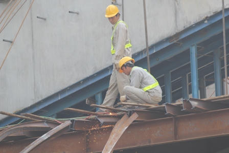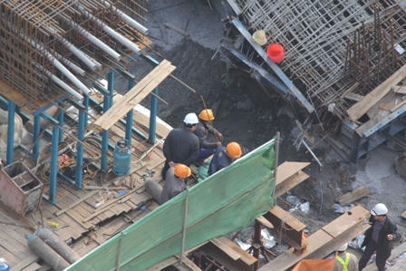Hàng chục công nhân đã thay phiên nhau tập trung khoan, phá, lớp bê thông đã khô cứng phía dưới bánh chiếc xe taxi này. Một xe cẩu cũng đã được huy động để nhấc chiếc xe taxi thoát khỏi đống sắt thép ngổn ngang.