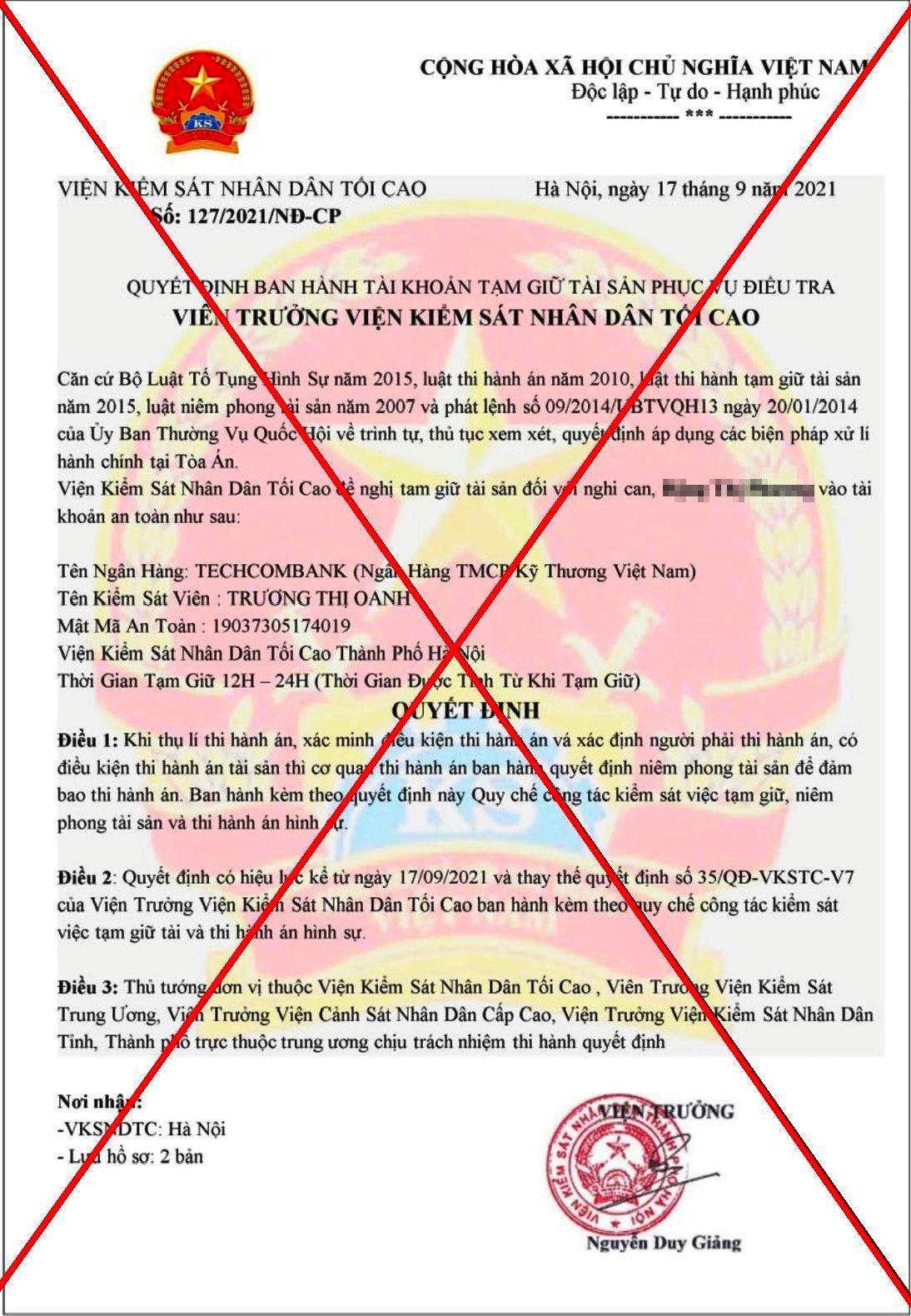 Các đối tượng lừa đảo làm giả quyết định của Viện kiểm soát nhân dân tối cao. |