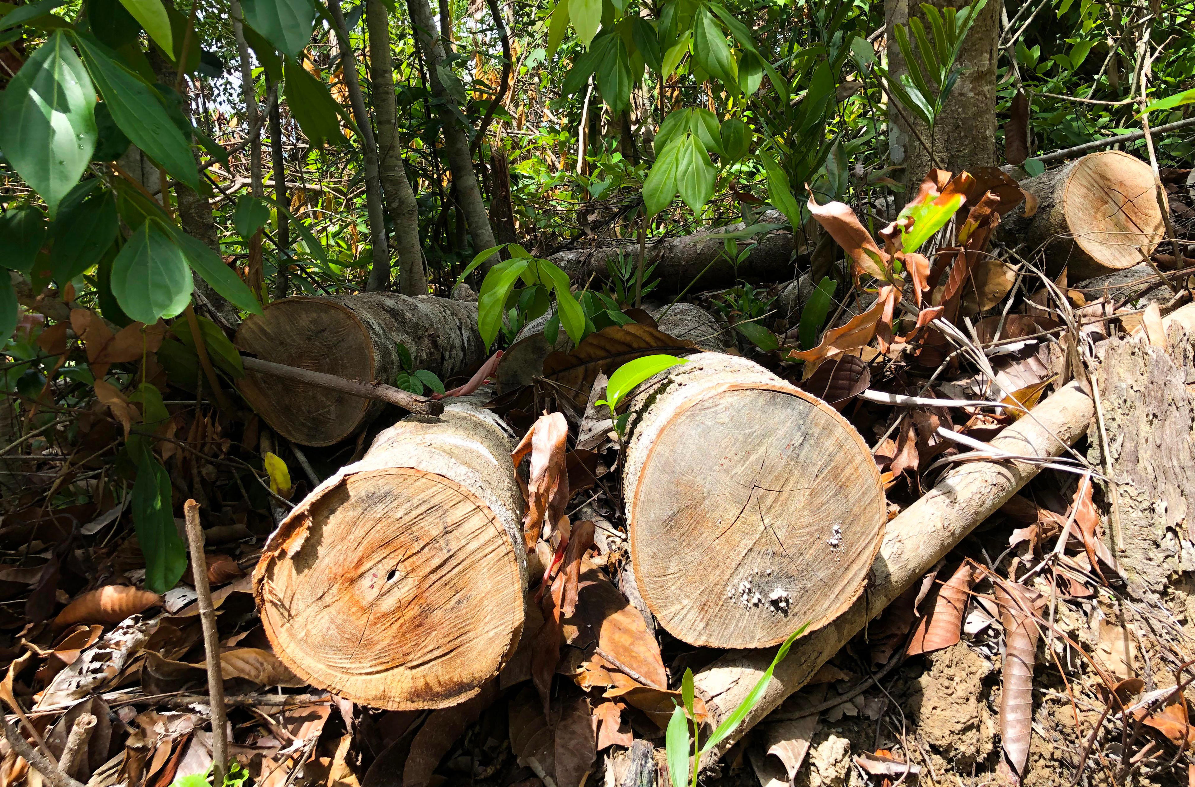 Dọc đường đi vào rừng có nhiều gốc cây với đường kính từ 30-40 cm bị cưa hạ gỗ còn nằm ngổn ngang. |