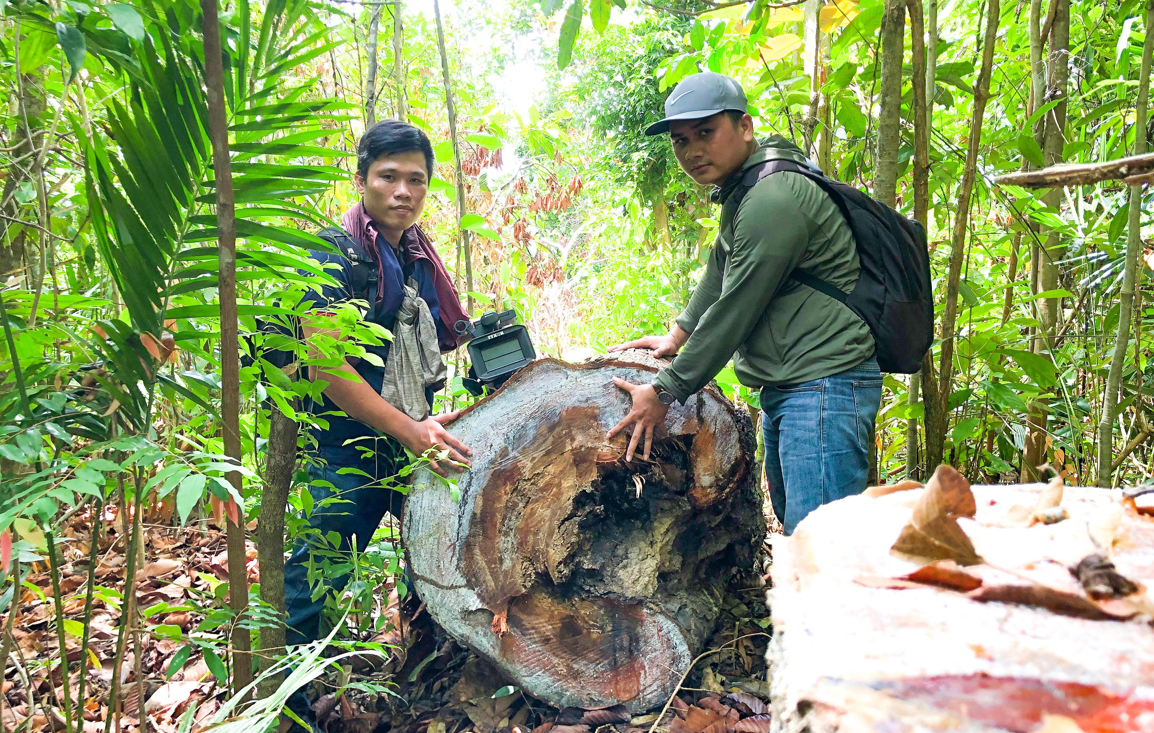 Khi đến nơi thấy rất nhiều gốc cây bị đốn hạ không thương tiếc, các đối tượng này cũng tự ý mở đường rộng khoảng 3 - 4 mét để vào sâu trong rừng phòng hộ. Tại đây, có những cây to với đường kính gần 1 mét cũng bị cưa hạ vẫn còn chảy nhưa, thân cây thì được chia thành nhiều đoạn nằm ngổn ngang trong rừng. Còn những cây có đường kính 20 -30 cm thì bị các đối tượng cưa thành nhiều khúc bằng nhau với chiều dài khoảng 1,5 mét được chất thành từng đống khác nhau chưa kịp chuyển xuống núi.