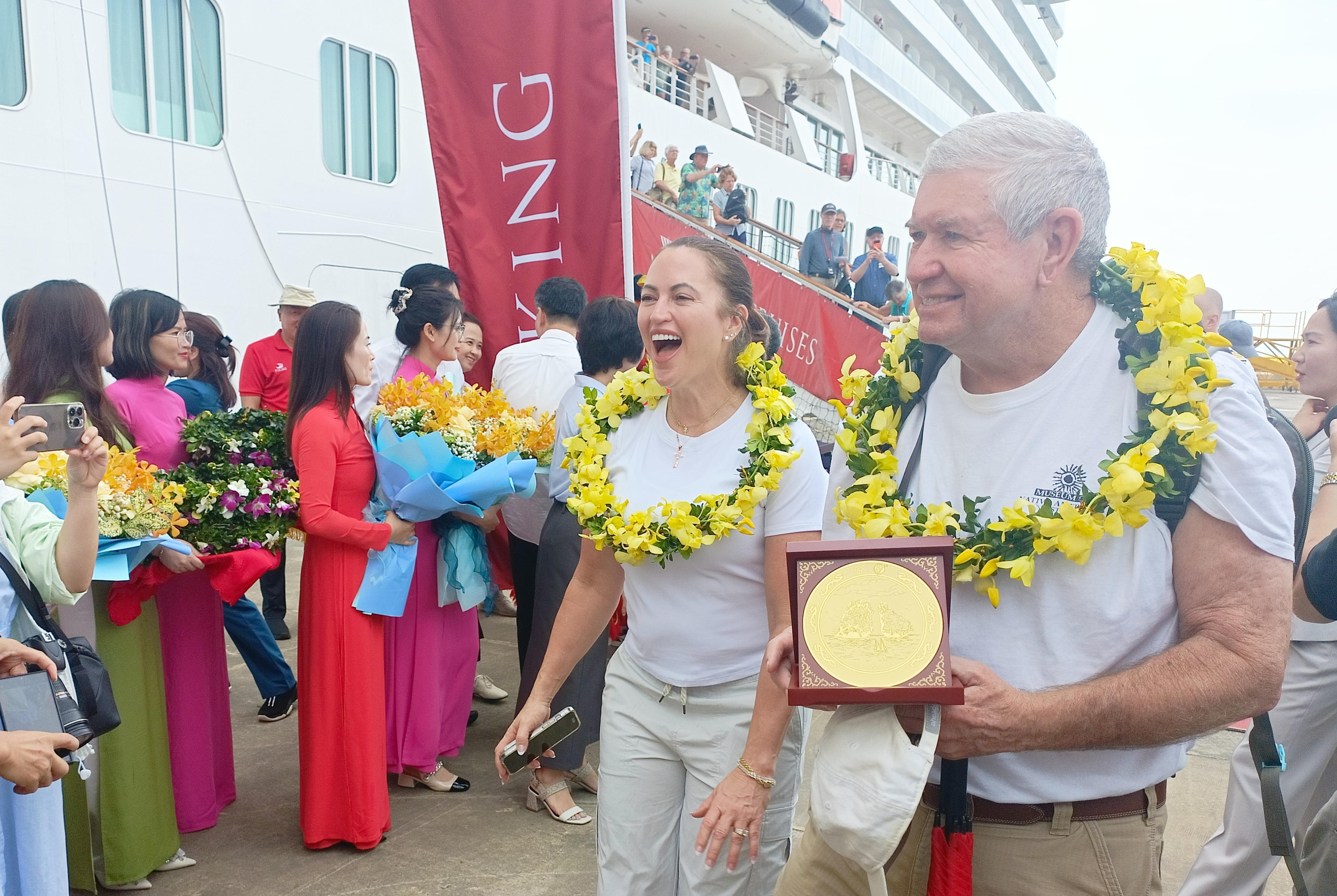 | Du khách vui mừng trước lễ đón tiếp nồng nhiệt của Quảng Ninh |