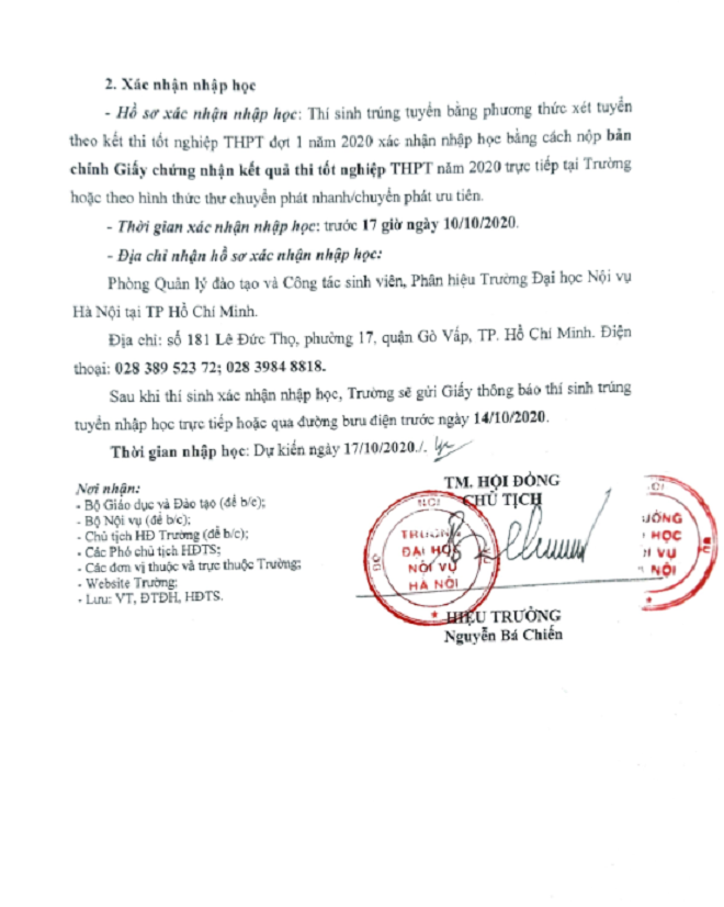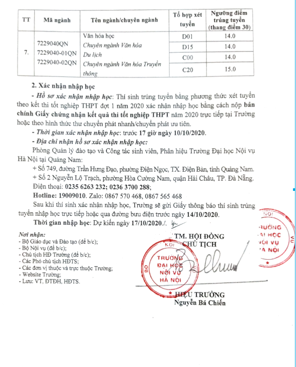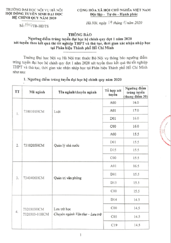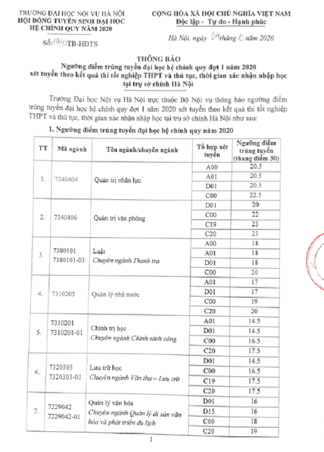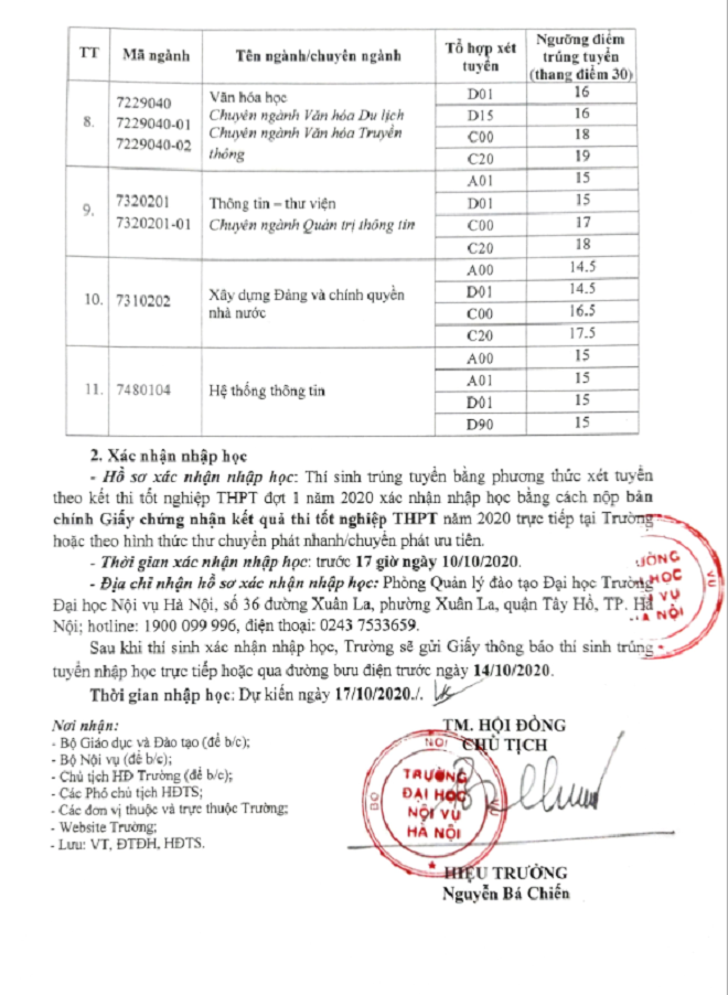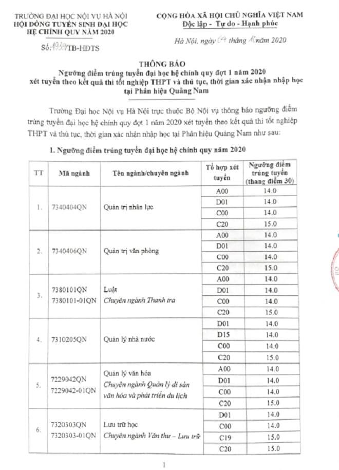 Chiều nay, trường Đại học Nội vụ Hà Nội công bố kết quả trúng trúng tuyển đại học chính quy theo phương thức xét tuyển kết quả thi tốt nghiệp THPT năm 2020. Mặt bằng điểm trúng tuyển của trường tăng từ 0,5 đến 1 điểm so với năm 2019.