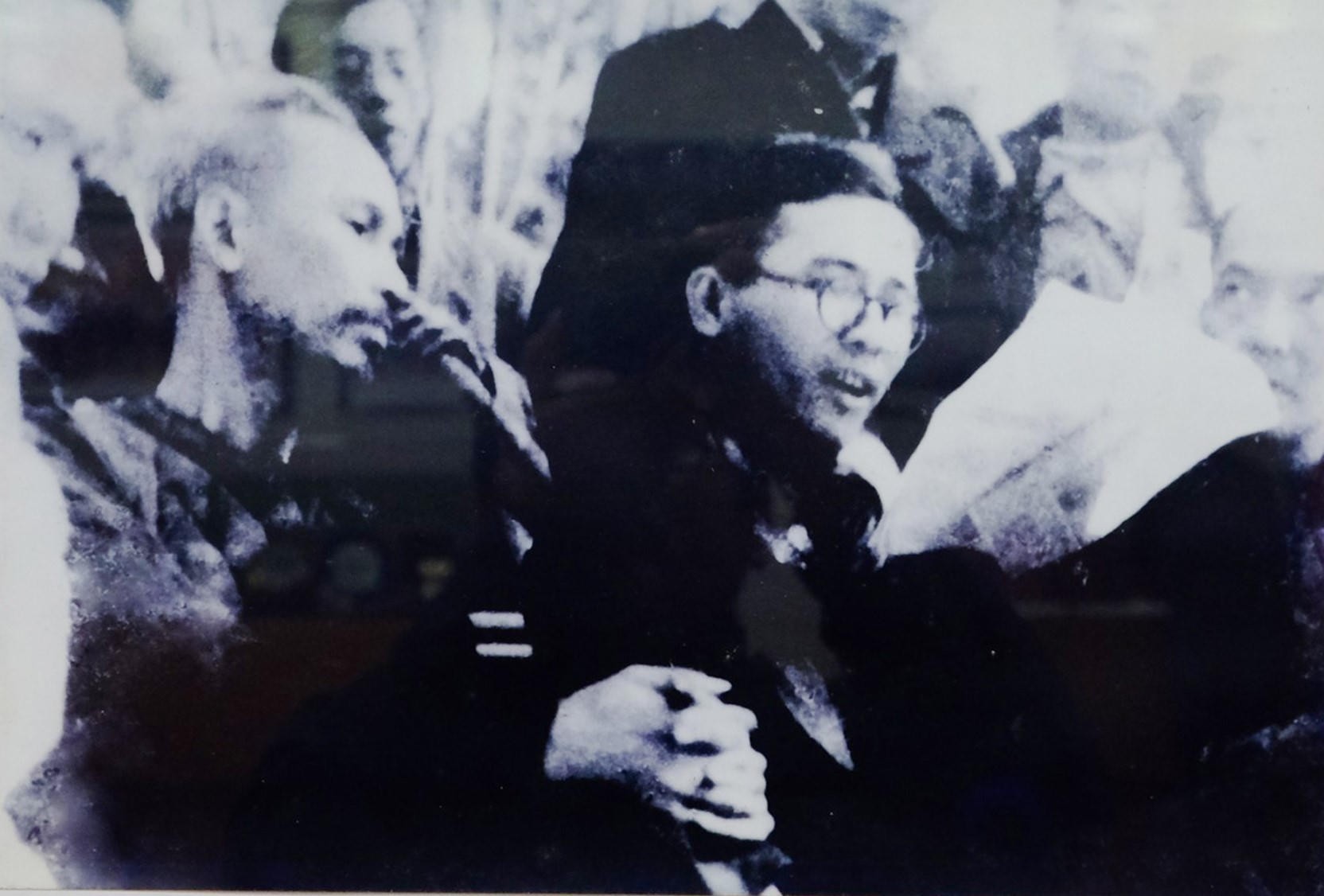 Chủ tịch Hồ Chí Minh nghe Thứ trưởng Bộ Tư pháp Trần Công Tường báo cáo công việc tại chiến khu Việt Bắc, năm 1948. (Ảnh tư liệu - Phòng truyền thống Bộ Tư pháp). |