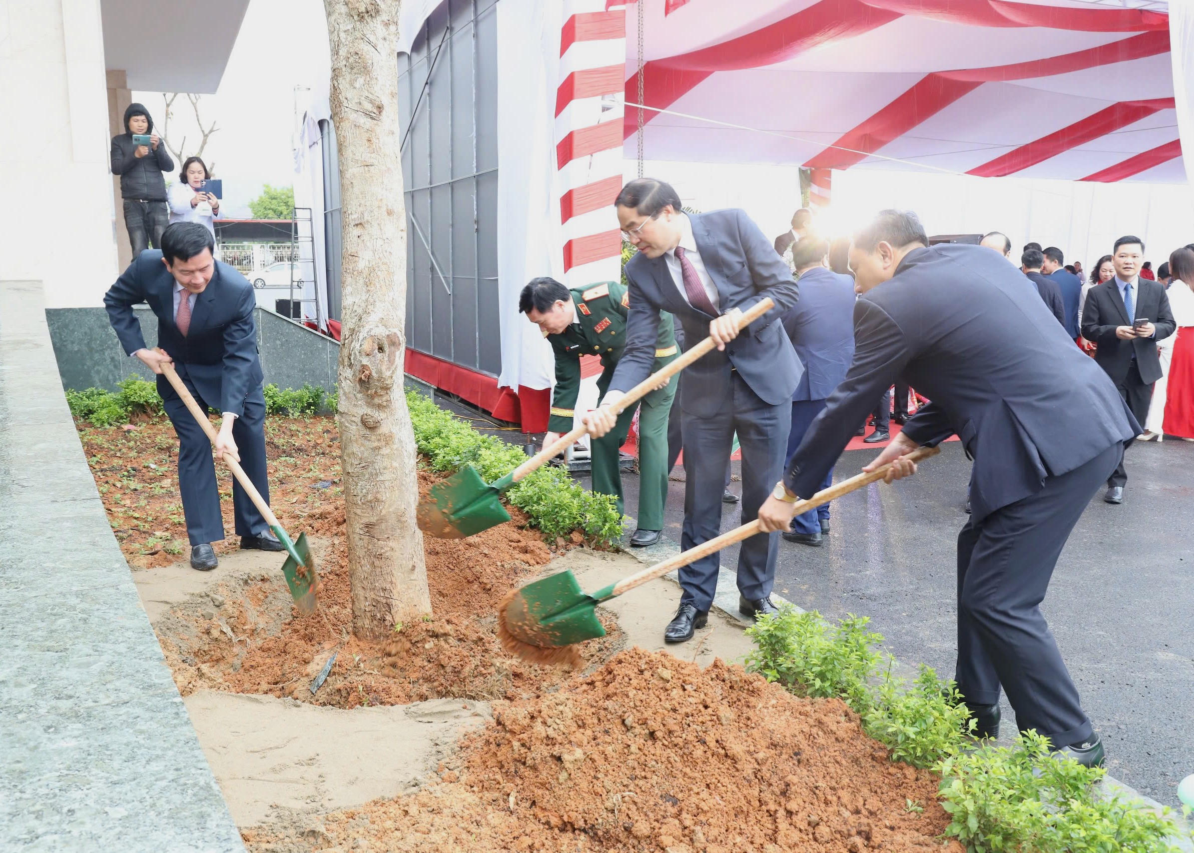 Lãnh đạo tỉnh Lào Cai trồng cây lưu niệm tại khuôn viên Tòa nhà kỹ thuật cao. |