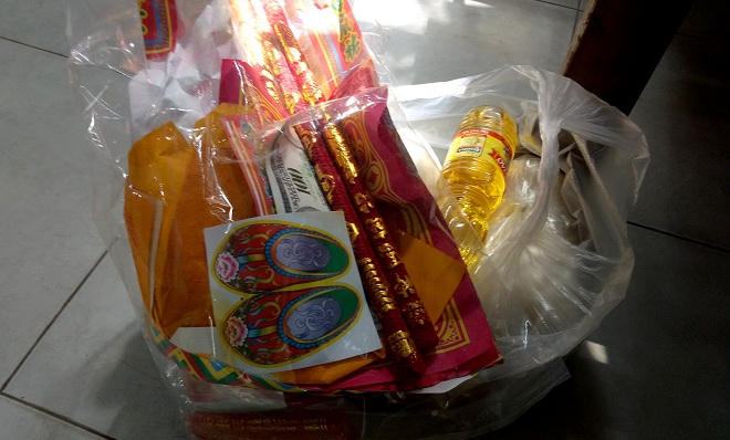 Nghe khách nói cúng nguyên năm, “nhanh như chớp” chị ta dúi vào tay tôi một bọc gạo muối nhưng chắc chắn không tới 6 kg. Khách hỏi giá, “bà chị tốt bụng” ngang nhiên "hét" “390 ngàn”. Khi khách thắc mắc giá cao, chị này giải thích: “Tại chị để thêm đèn cầy, dầu ăn, giấy tiền vàng bạc cho đủ lễ để cúng bà”.