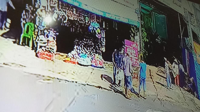 | Hai đối tượng (áo trắng - xanh) quây quanh “ép” du khách mua 3 cây nhang với giá 270.000 đồng (ảnh trích từ camera quan sát của lực lượng công an) |