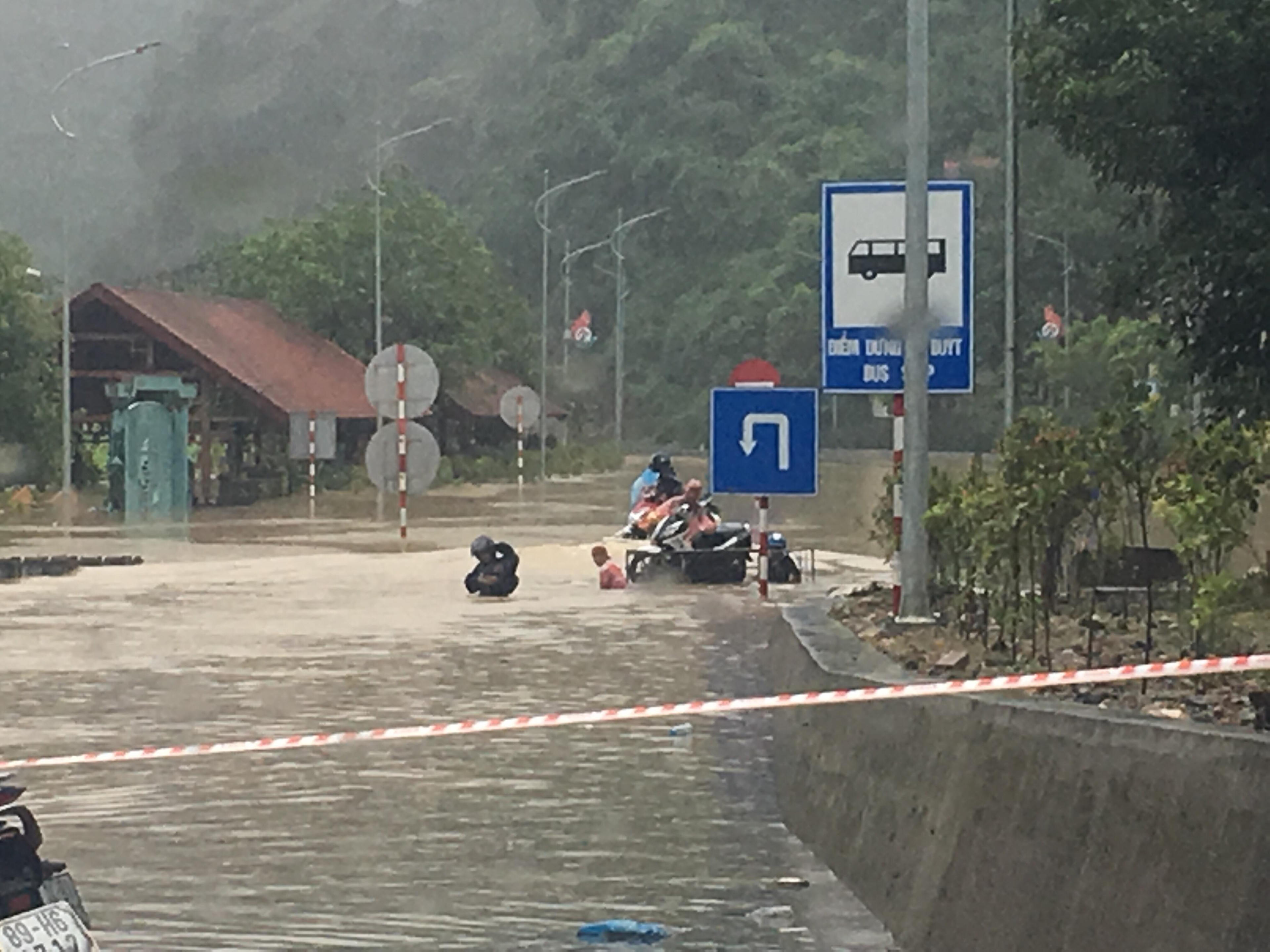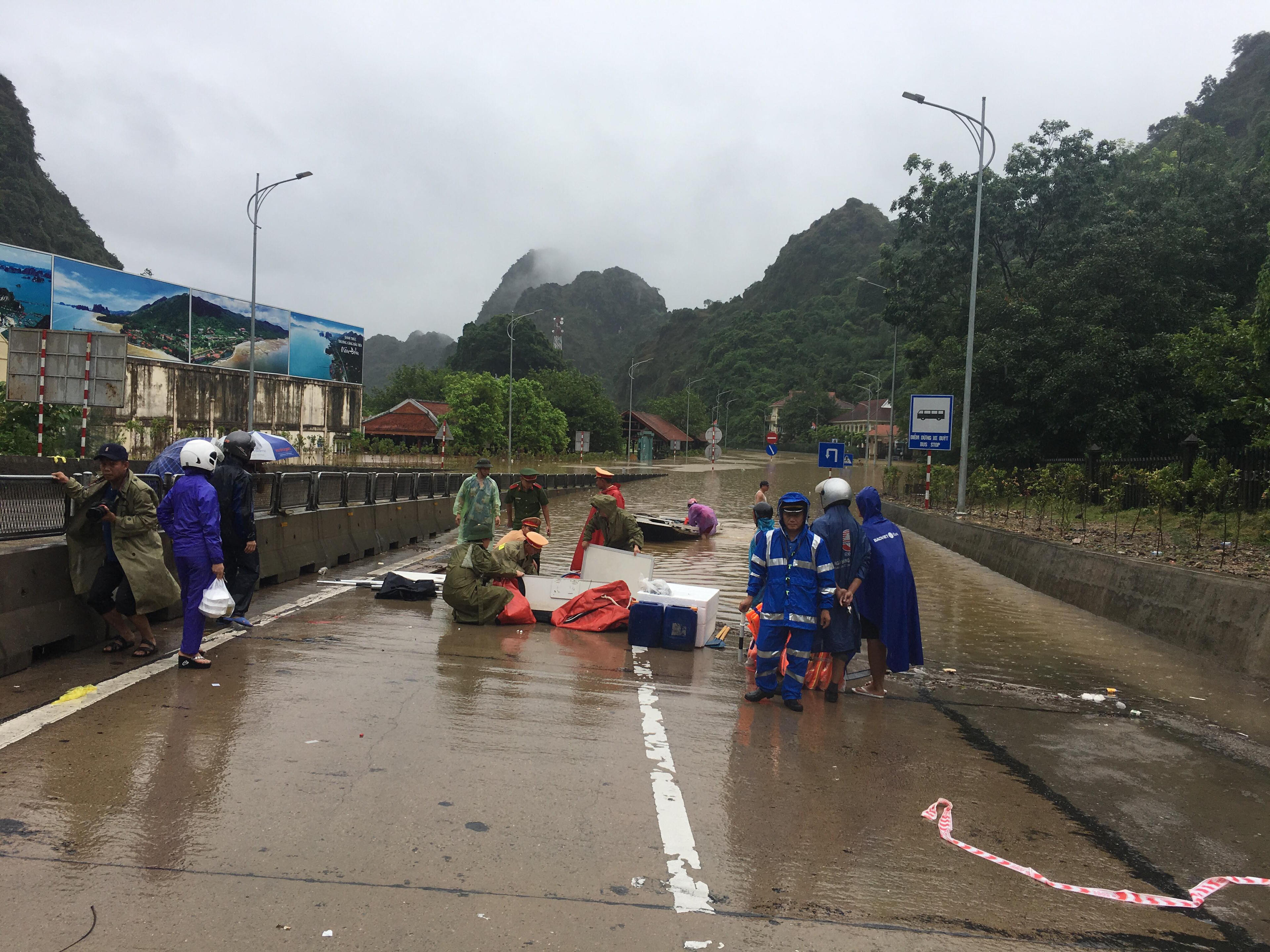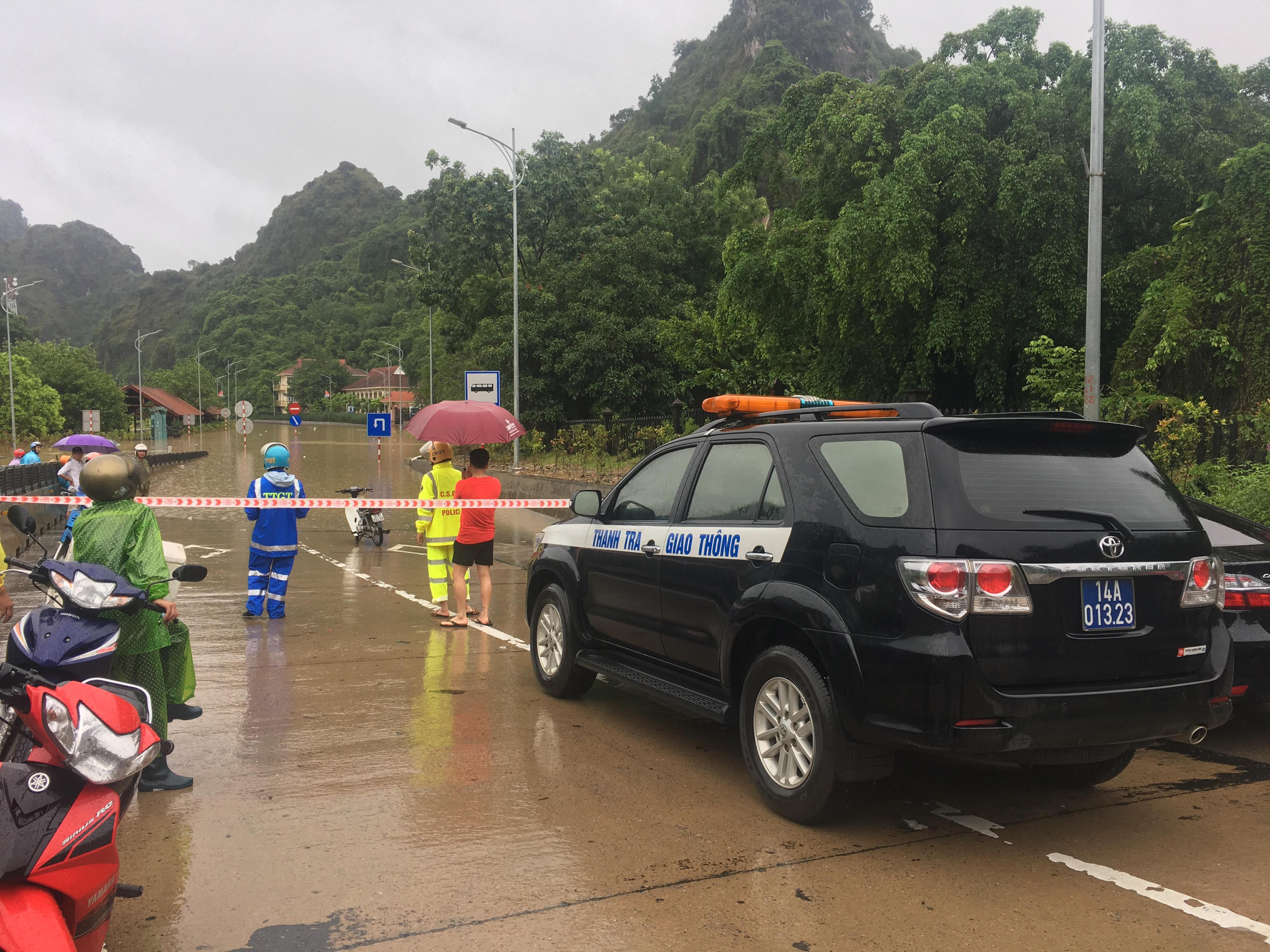 Lực lượng CSGT Quảng Ninh đã tiến hành giăng dây rào, đặt biển cấm, hướng dẫn các phương tiện chuyển hướng, tránh khu vực ngập lụt.