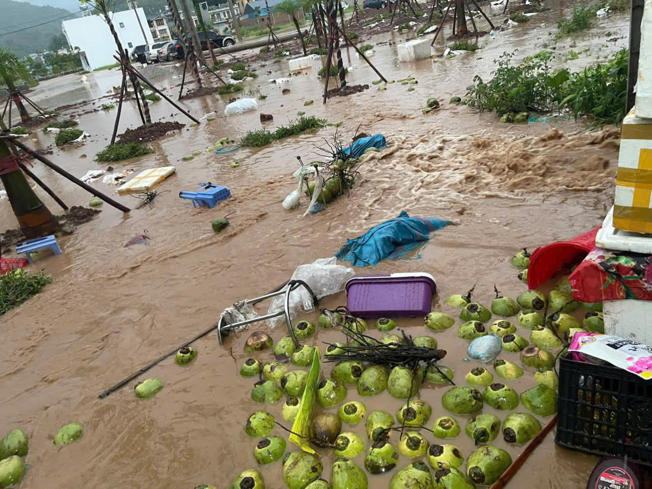 Nước lũ kéo hàng hóa và rác thải tràn ra đường (Ảnh: CTV). |