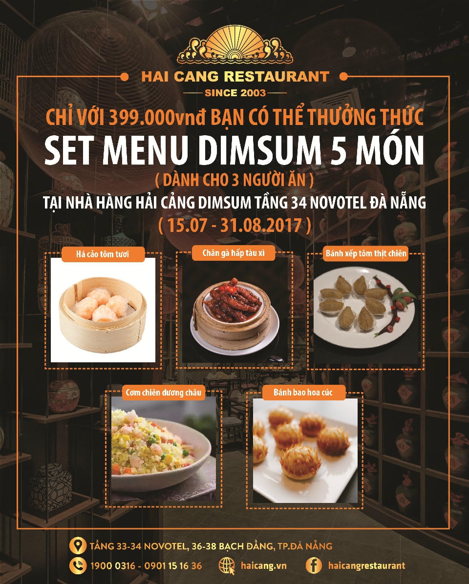 (PLO) -Kéo dài từ giữa tháng 7 tới hết tháng 8/2017, nhà hàng Hải Cảng tầng 33-34 Novotel Đà Nẵng lần đầu tiên ra mắt combo dimsum đặc biệt kèm theo chương trình ưu đãi hấp dẫn như giảm giá giờ vàng 50% hay tặng quà sinh nhật ý nghĩa cho thực khách.