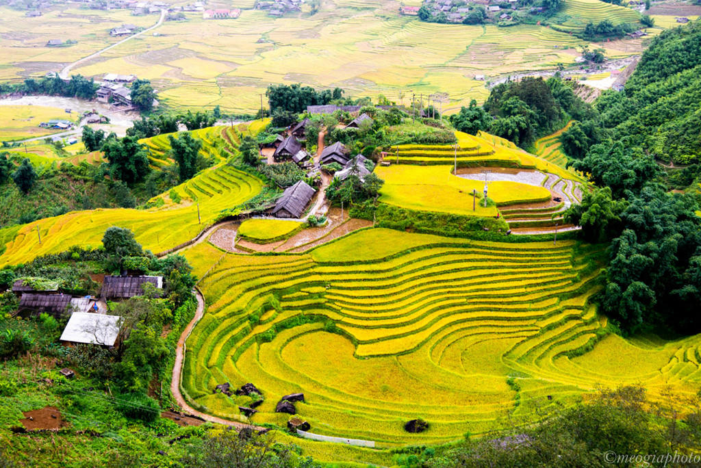 Nhìn từ trên cao trải dài qua những ngọn đồi tầng tầng lớp lớp những thửa ruộng chín vàng, thỉnh thoảng đan xen một tầng lúa hơi xanh, thấp thoáng có những chỗ người dân đang thu hoạch lúa đã chín, tất cả tạo nên một bức tranh đẹp kỳ vĩ mà bất kỳ du khách nào khi chiêm ngưỡng cũng phải trồn trồ khen ngợi .