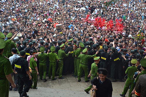 Sau khi mở cửa hàng rào sắt, hàng ngàn người ào lên, cố chen chân để lên đền làm lễ sớm. Mặc dù cảnh sát trật tự, cơ động được bố trí dày đặc theo nhiều vòng nhưng lượng người quá đông nên không tránh khỏi tình trạng chen lấn, xô đẩy.