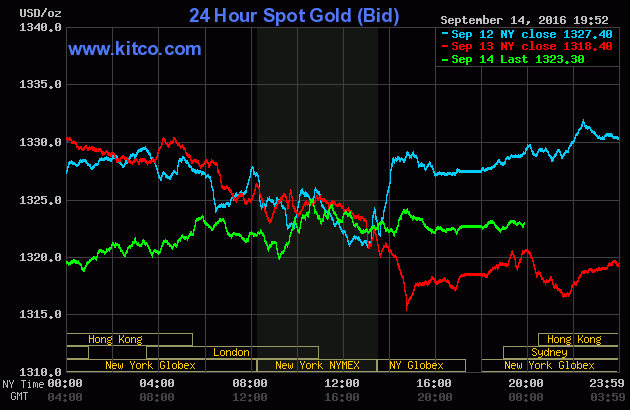 Sáng nay 7:00 theo giờ Việt Nam, giá vàng giao ngay trên sàn Kitco đứng tại 1.323,3USD/oz, tăng 0,37% so với chốt phiên trước. Trước đó, có thời điểm giá vàng xuống 1.315,27 USD - mức thấp nhất hơn một tuần. Tương tự, vàng kỳ hạn cũng tăng nhẹ 0,18% lên 1.326,1 USD.