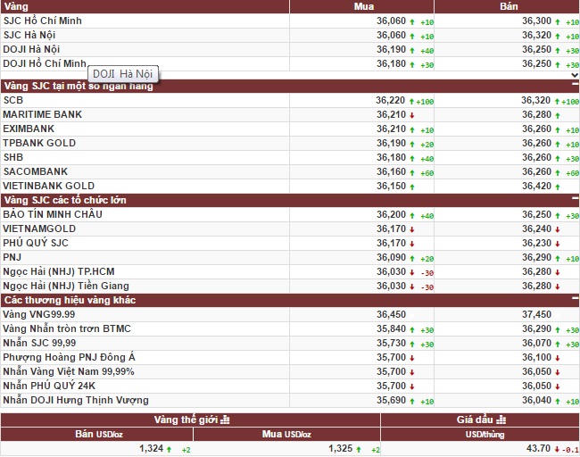 Giá vàng SJC giao dịch tại thị trường Hà Nội tại mức 36,06 - 36,32 triệu đồng/lượng (chiều mua – bán). Tương tự, giá vàng SJC của tập đoàn Doji tại Hà Nội và TP HCM được niêm yết tại mức giá 36,19– 36,25 triệu đồng/lượng (chiều mua – bán).