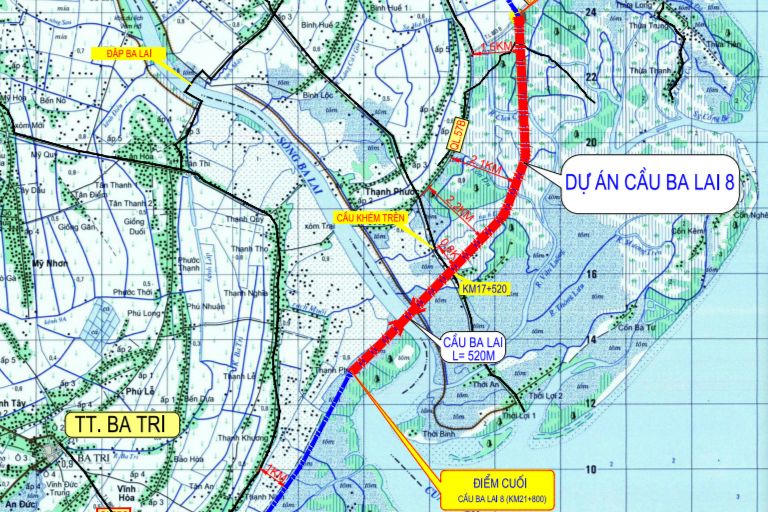 Dự án xây dựng cầu Ba Lai 8 trên tuyến đường bộ ven biển với điểm đầu Dự án tại Km8+900 thuộc xã Thạnh Phước, huyện Bình Đại và điểm cuối tại Km21+800 thuộc xã Bảo Thạnh, huyện Ba Tri.
